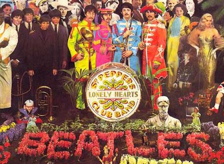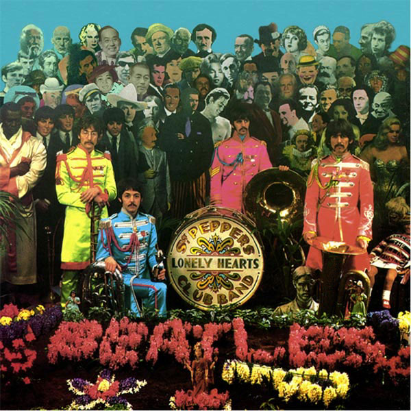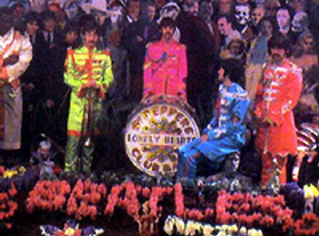 (dressed as Sgt. Pepper's Band), posed in front of a 'crowd scene'